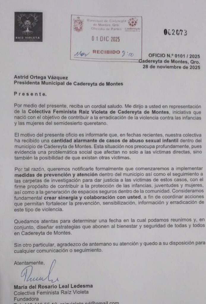Portada » Hay “cantidad alarmante” de abuso sexual infantil en Cadereyta de Montes, advierte Raíz Violeta