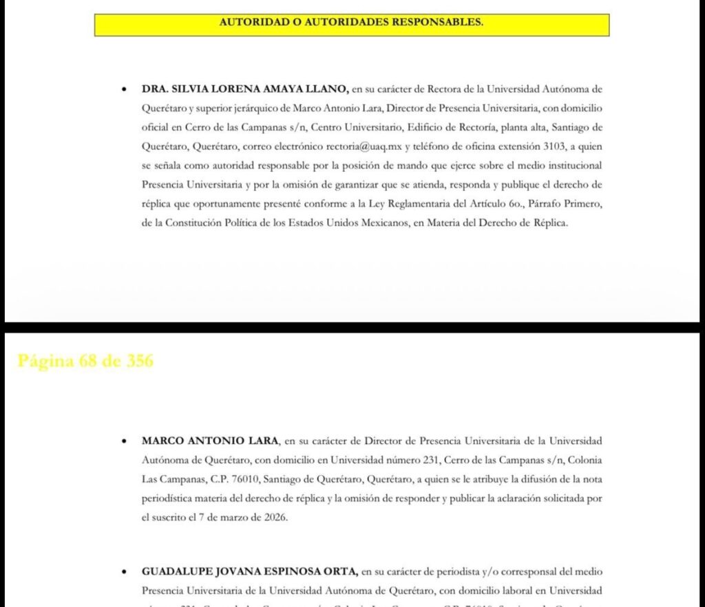 El documento también fue hecho del conocimiento de Silvia Lorena Amaya Llano, rectora de la Universidad Autónoma de Querétaro, lo que acredita que la institución tuvo conocimiento formal del procedimiento extrajudicial de derecho de réplica y, aun así, no publicó la aclaración pedida en los mismos espacios donde difundió la nota original.
