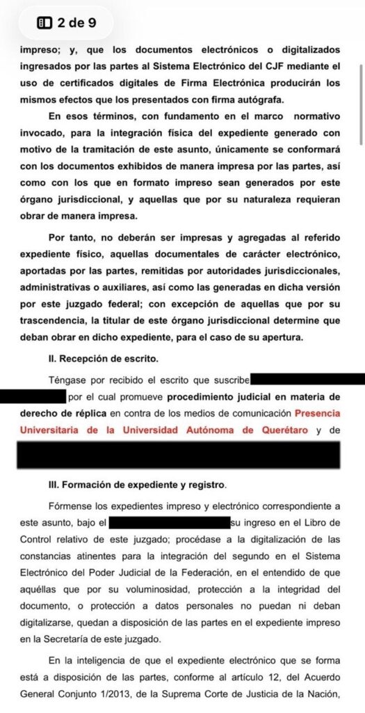 La solicitud fue presentada el 7 de marzo de 2026 y dirigida a Marco Antonio Lara, director de Presencia Universitaria, así como a la periodista Jeovana Espinoza, señalando que la nota difundida omitió informar que la resolución del expediente TEEQ-PES-11/2025 ya había sido impugnada ante la Sala Regional Toluca del Tribunal Electoral del Poder Judicial de la Federación, por lo que no constituía una determinación firme.